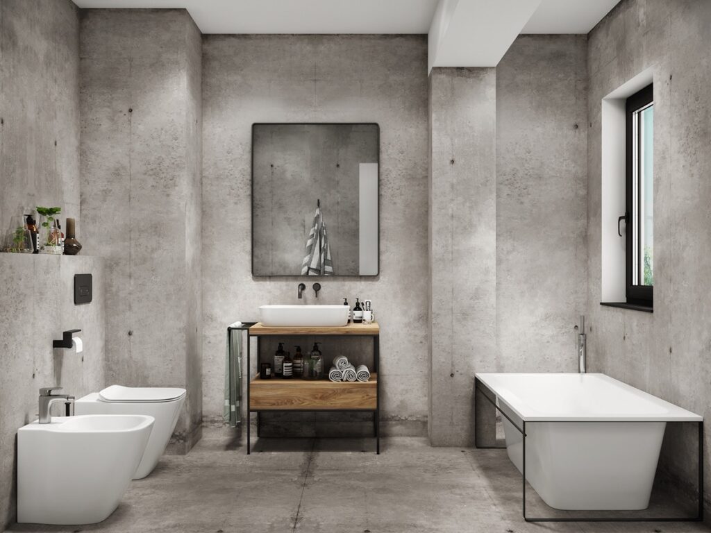 Gaya industri dapat menjadi solusi segar untuk menghindari kesan monoton pada kamar mandi Anda, terutama jika rumah Anda mengusung konsep minimalis. Anda bisa melihat kamar mandi minimalis yang diberi sentuhan industrial tampak menarik melalui dinding dan lantai beton yang terbuka.